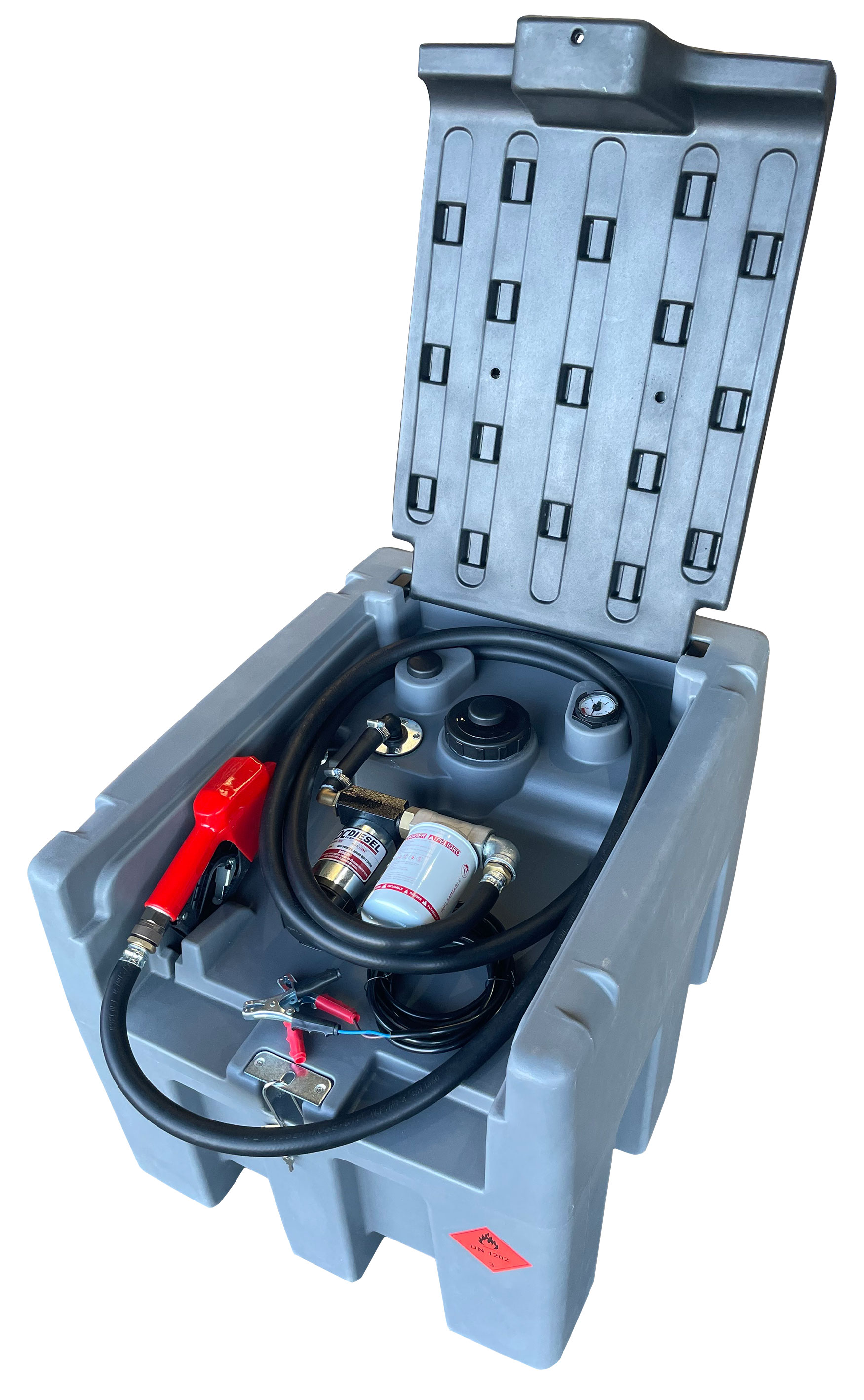 UV stabilised diesel grade polyethylene polytuff tank, 12 volt Diesel Power Selfpriming pump, 40L/Min open flow, High quality auto shut off trigger, 4m of 3/4" delivery hose with swivel and crimped fittings, 4m wiring harness with alligator clips,